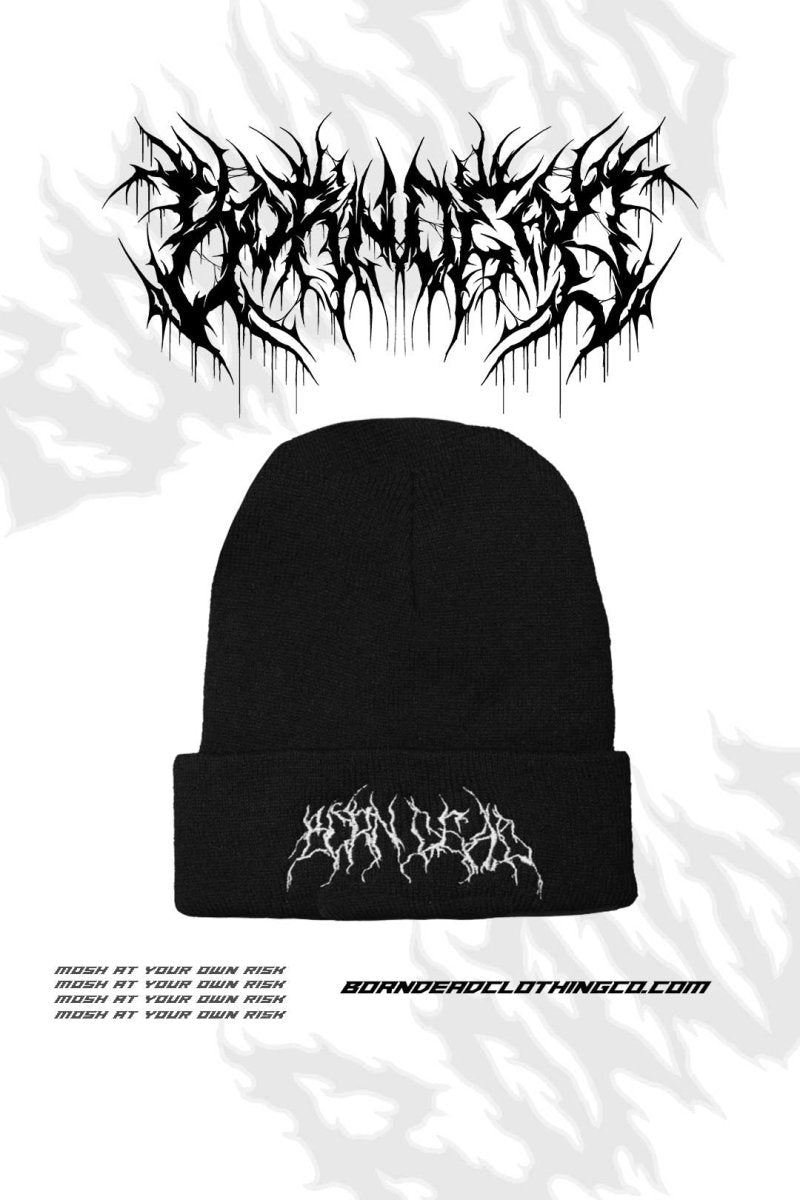 Black death metal inspired beanie with white embroidered "BORN DEAD"
