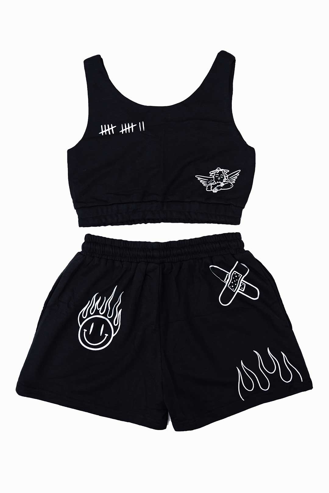 These are our Cry Baby crop top / short lounge wear pieces. Perfect for going out, hanging at the house or running errands. The designs consist of a dog, barbed wire, bandaids, flames, heart, smily face, angel.