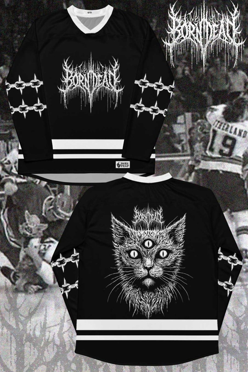 The Born Dead Hockey Jersey is made of a polyester mesh jersey material. The designs consist of a cat design, Born Dead text logo and chains. Perfect to wear over a hoodie and to complete the look of a hockey jersey. The designs are printed.